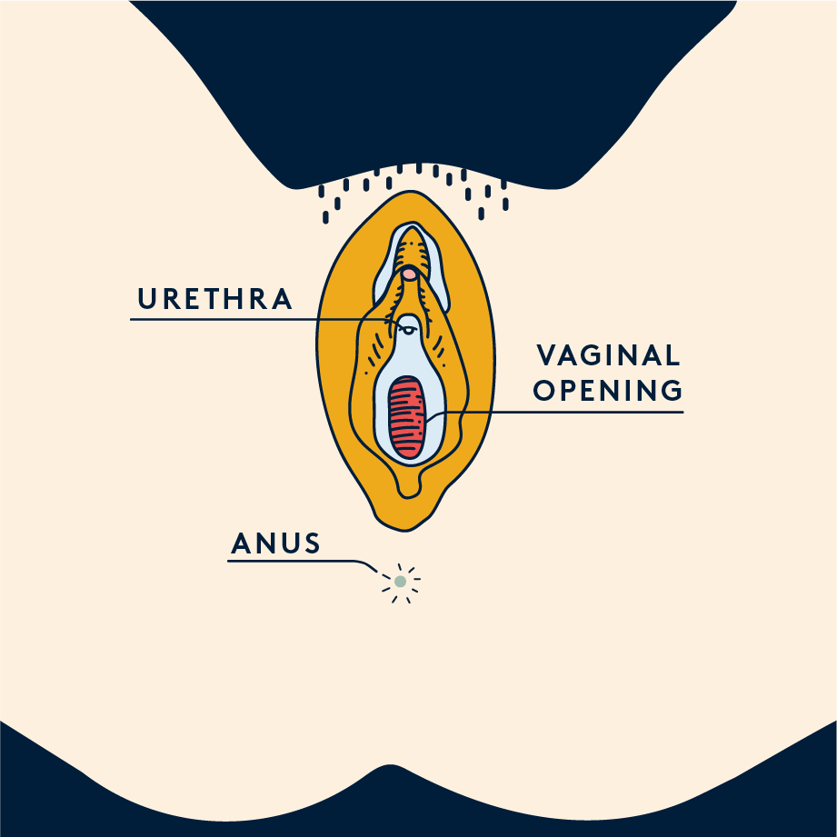 There are three holes you'll need to be aware of: the urethra, the vagina, and the anus. The vagina is located between the urethra and anus and is the opening that leads to the cervix and then the uterus – which is where blood comes from during the menstrual cycle.