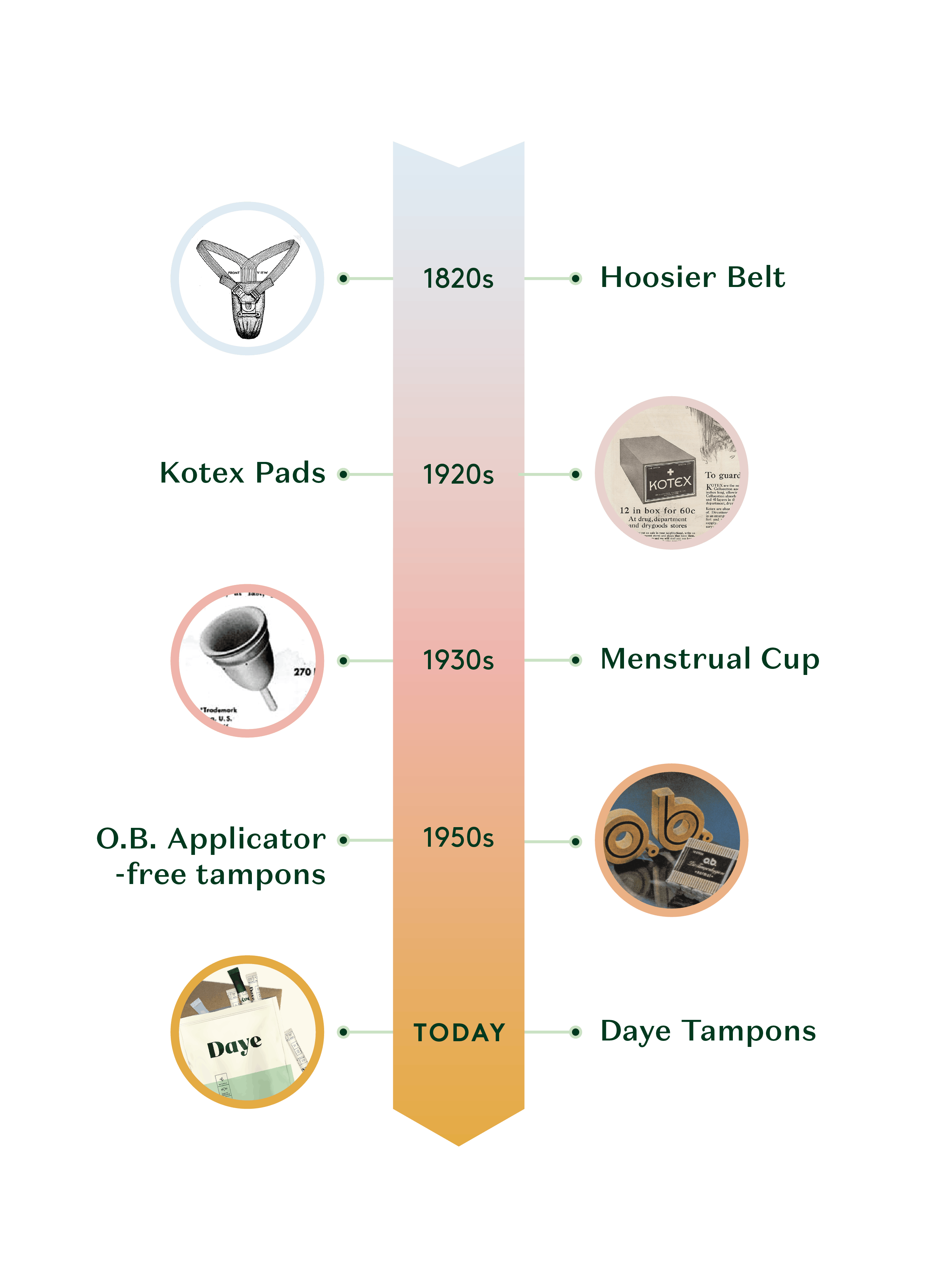 The word “period” as a term for menstruation first comes into use in 1822, and towards the end of the century, people started realising that just bleeding into one’s clothes wasn’t exactly sanitary. Enter: the Hoosier Sanitary Belt, a contraption that pinned to a washable cloth pad. Then, in 1888 Johnson & Johnson launches Lister’s Towels, the first disposable menstrual pad to be commercially available, but because menstruation was such a taboo topic, the product had very little success and was soon pulled from market.