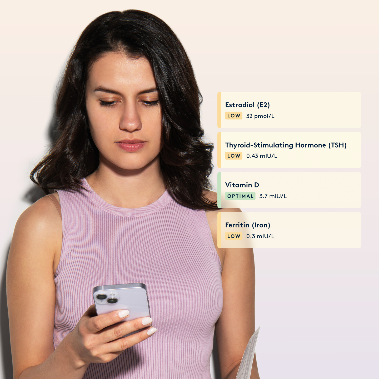 We measure FSH, LH, Prolactin, Estradiol, Testosterone, FAI, SHBG, TSH, T4, Ferritin, Vitamin D, that impact your cycle, fertility, and overall wellbeing.