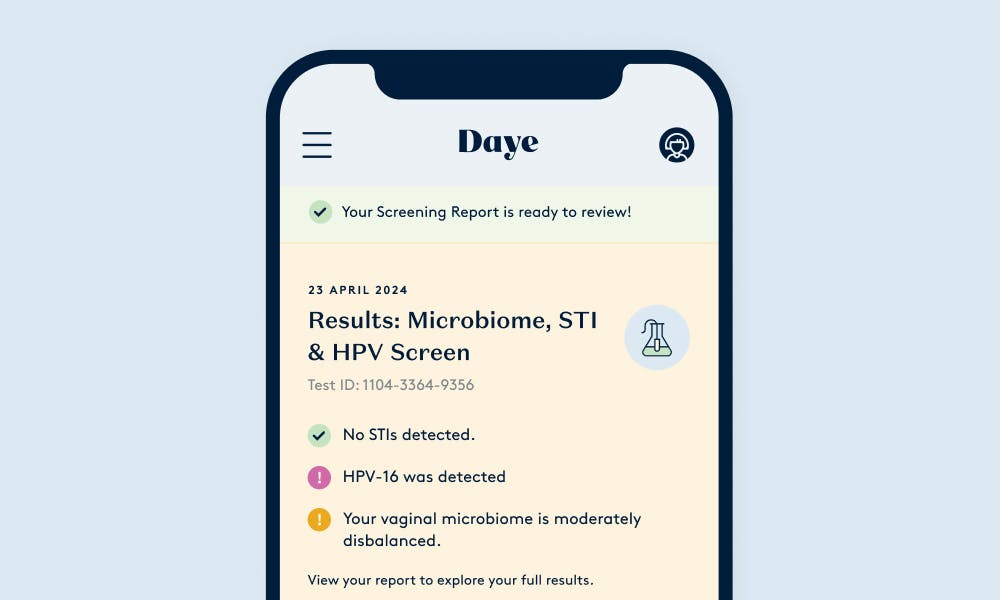 After you receive your results, you will be able to book a consultation with a vetted specialist and order medication (subject to additional costs and availability). We also help you make lifestyle changes to improve your gynaecological health. Did you know that everything from your contraception and condoms to underwear materials, can impact the composition of good and bad bacteria in your vagina? Stay in the know with Daye's screen and invest in interventions that actually work.