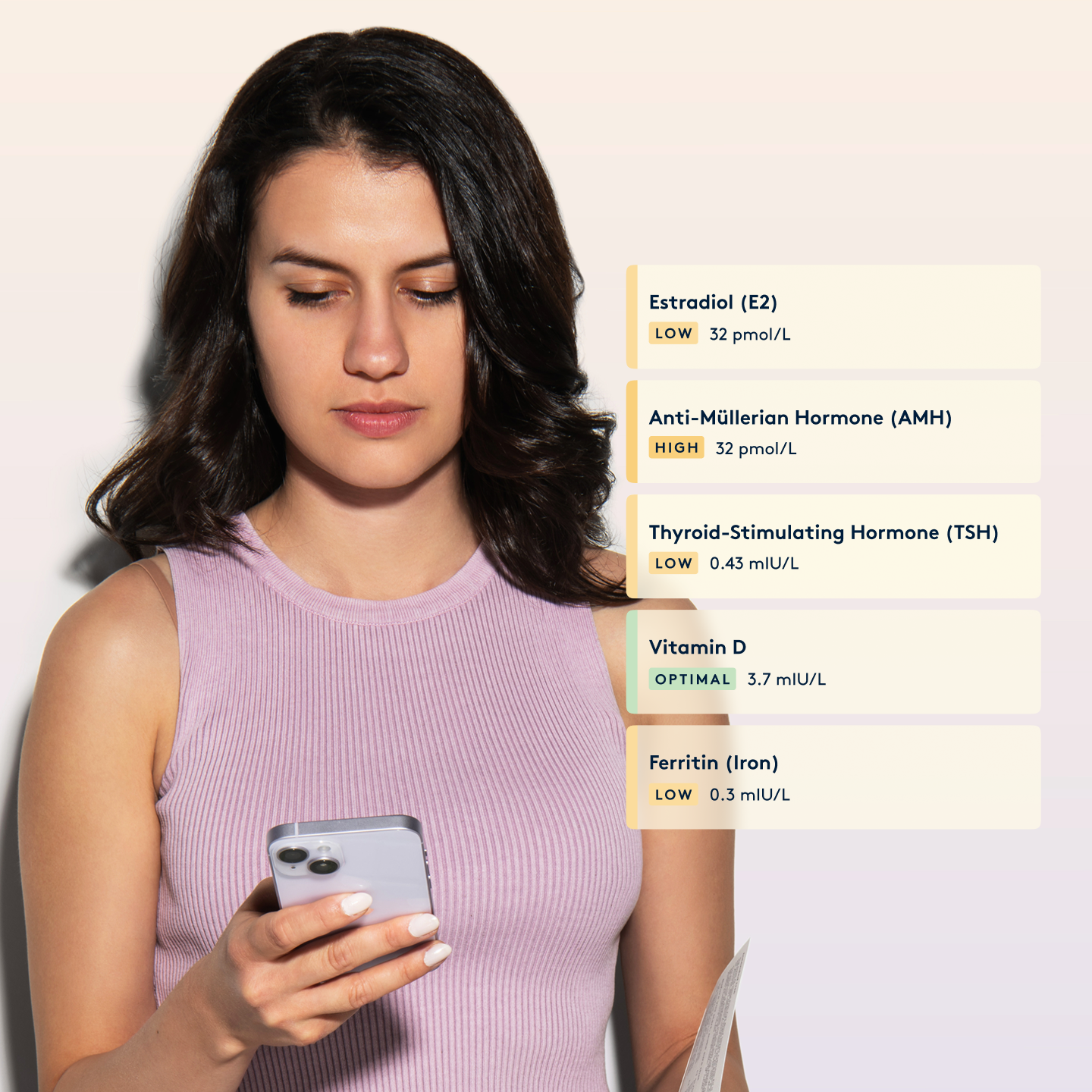 We measure FSH, LH, Prolactin, Estradiol, Testosterone, Free Androgen Index, SHBG, TSH, T4, Ferritin, Vitamin D, plus Anti-Müllerian Hormone (AMH). AMH gives insight into your ovarian reserve - the number of eggs you may have left.
