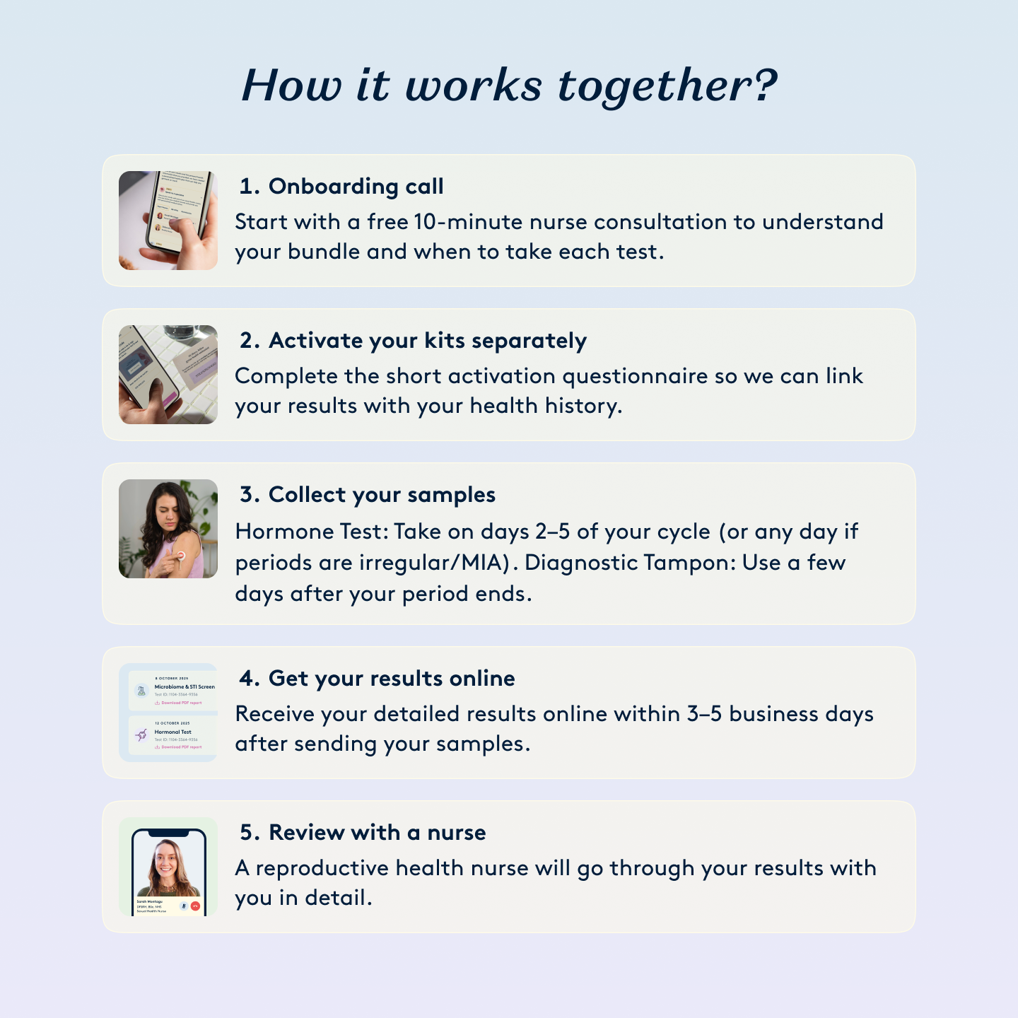 Start with a free 10-minute nurse consultation to understand your bundle and when to take each test.