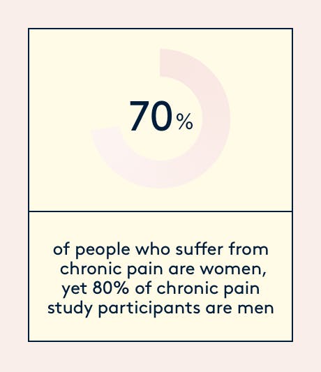 In the case of chronic pain, 80% of study participants are male even though 70% of those affected by chronic pain are women, who usually tend to feel it more often and more intensely than men. Take endometriosis, for example. The condition affects 1 in 10 women, costs the UK economy £2.4 billion annually, yet it takes 7.5 years on average to diagnose.